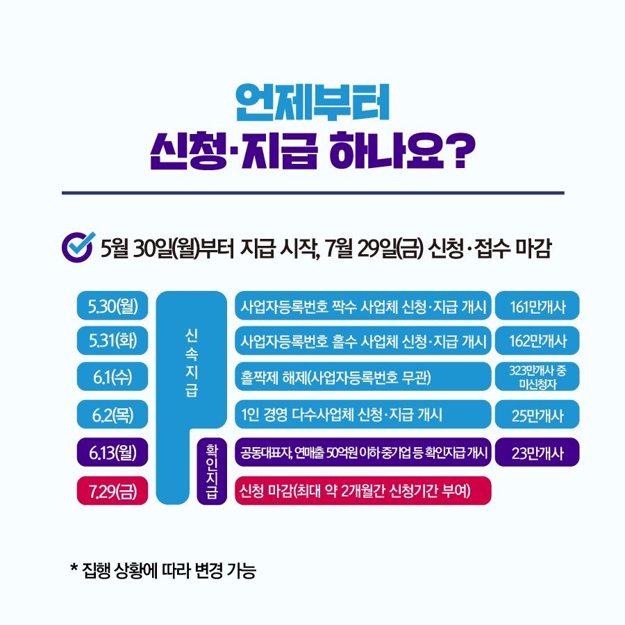 신속지급 업체지만 1명이 여러 사업체를 경영하는 25만곳의 경우에는 6월 2일 신청과 지급이 시작되고, 안내문자도 6월 2일 발송됩니다.