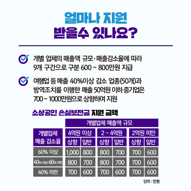 코로나19 방역 조치로 피해를 입은 소상공인·자영업자 371만명은 5월 30일 오후 부터 최대 1천만원의 손실보전금을 순차적으로 지급 받을 수 있습니다.