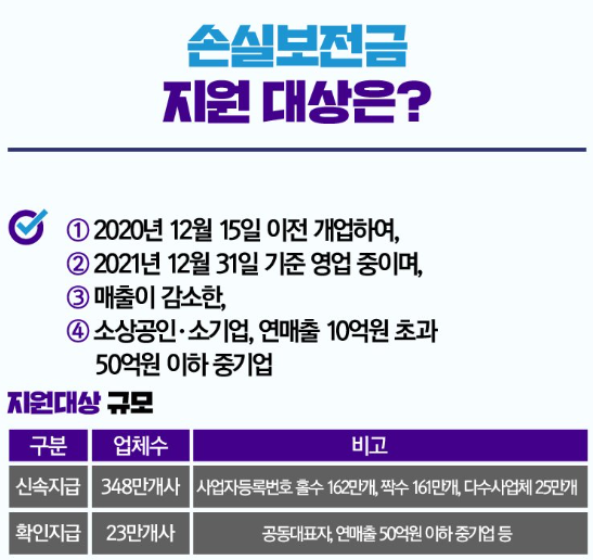 손실보전금 지원 대상은 작년 12월 15일 이전에 개업해 같은달 31일 기준 영업 중이면서 매출액이 감소한 소상공인·소기업, 연매출 10억원 초과 50억원 이하 중기업입니다.